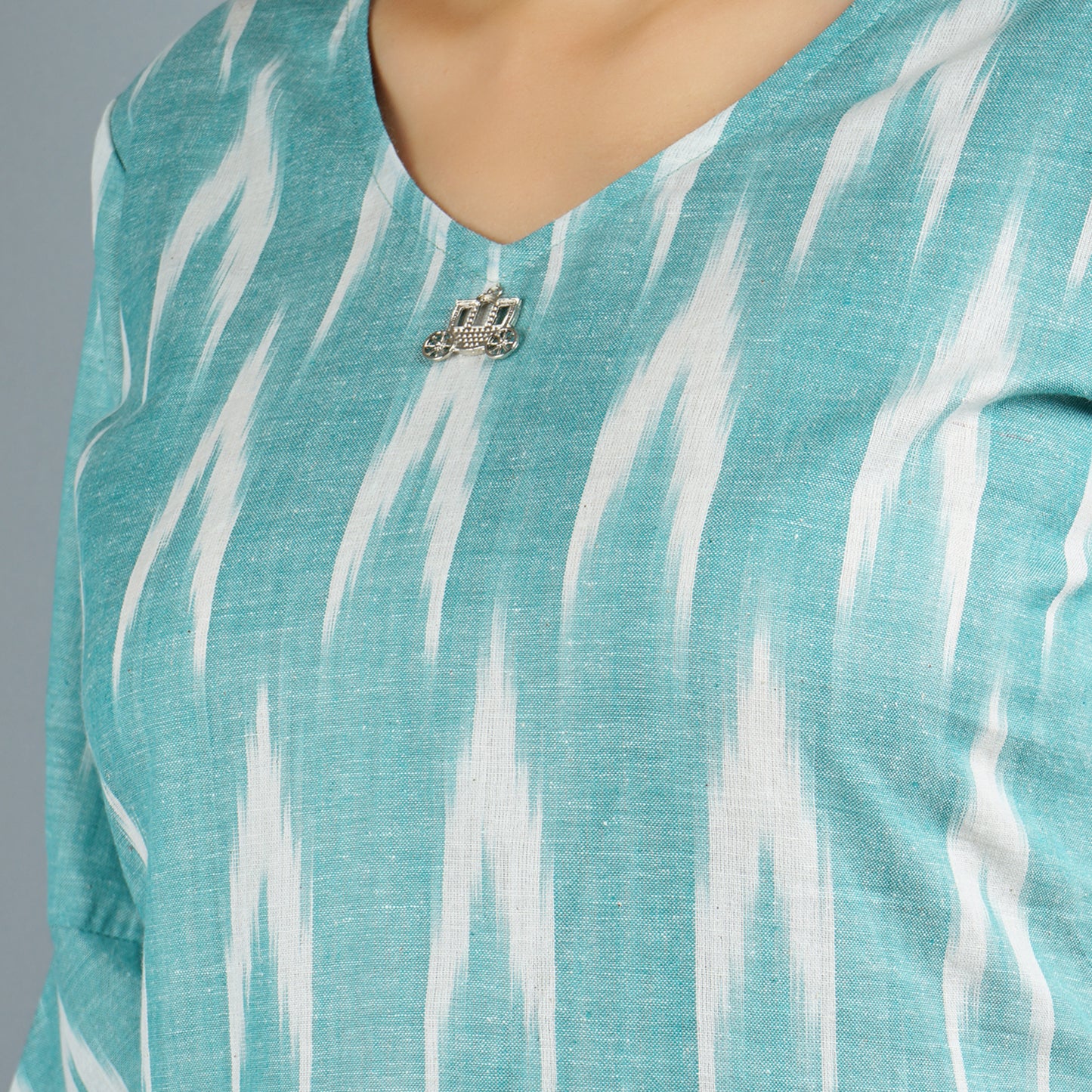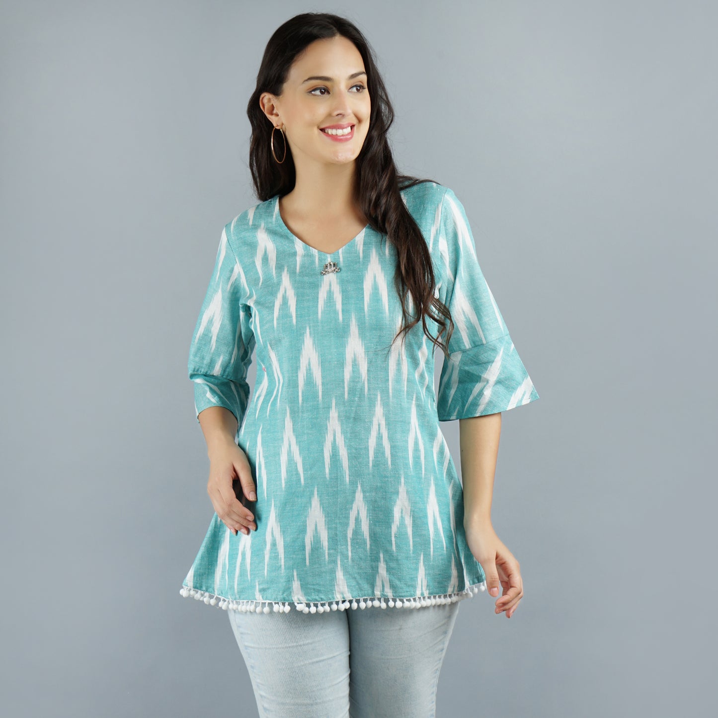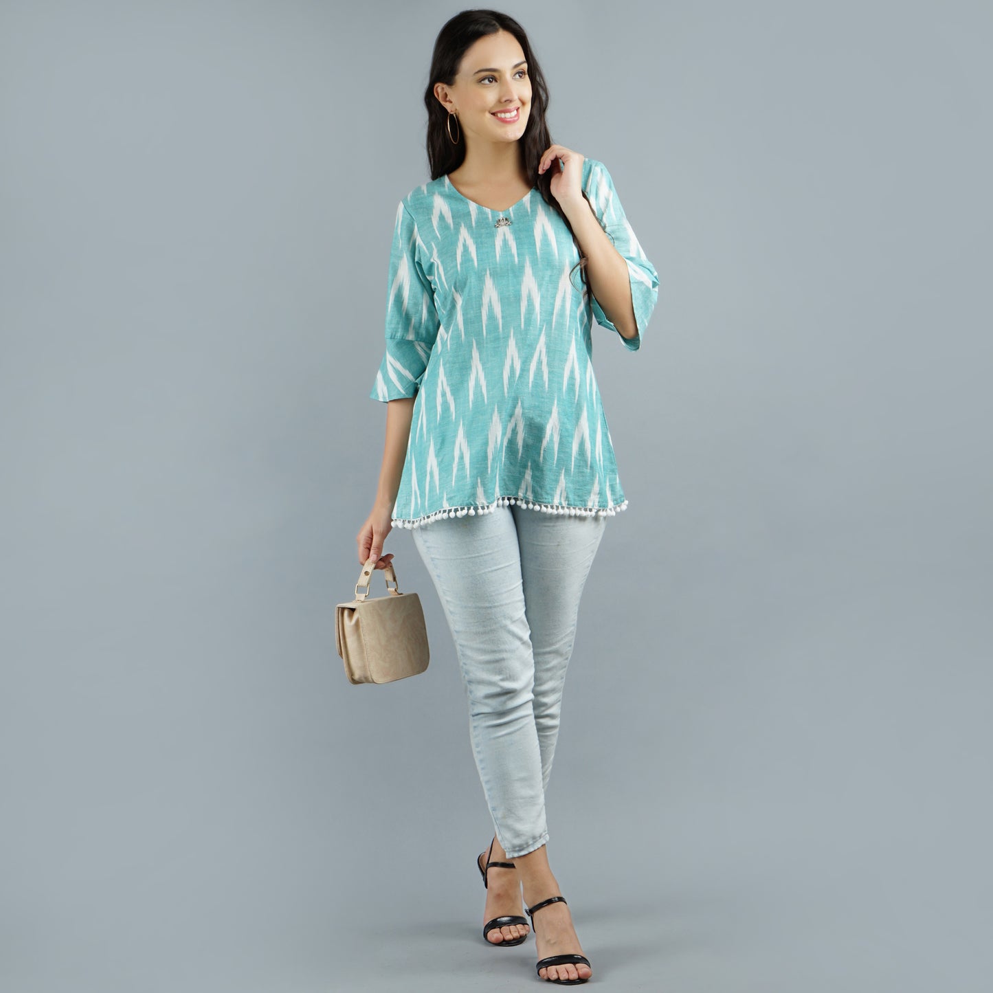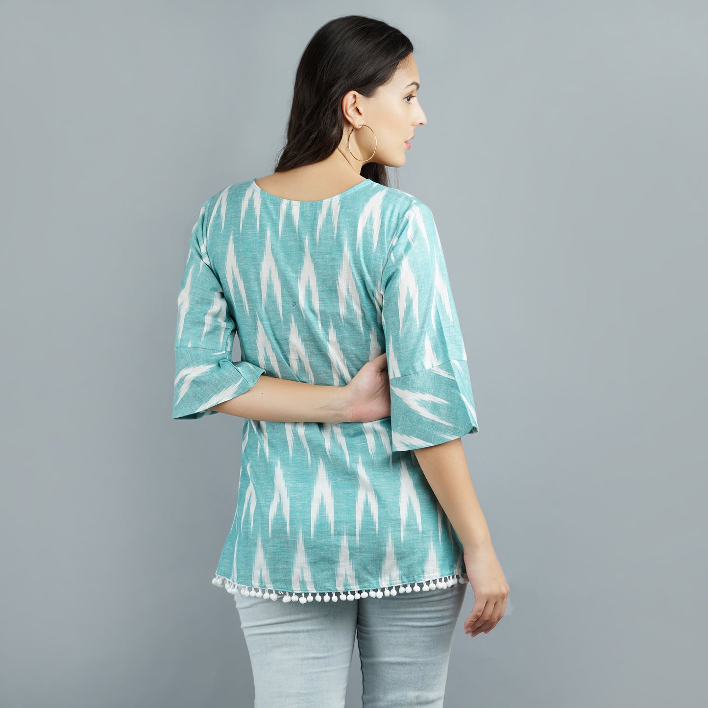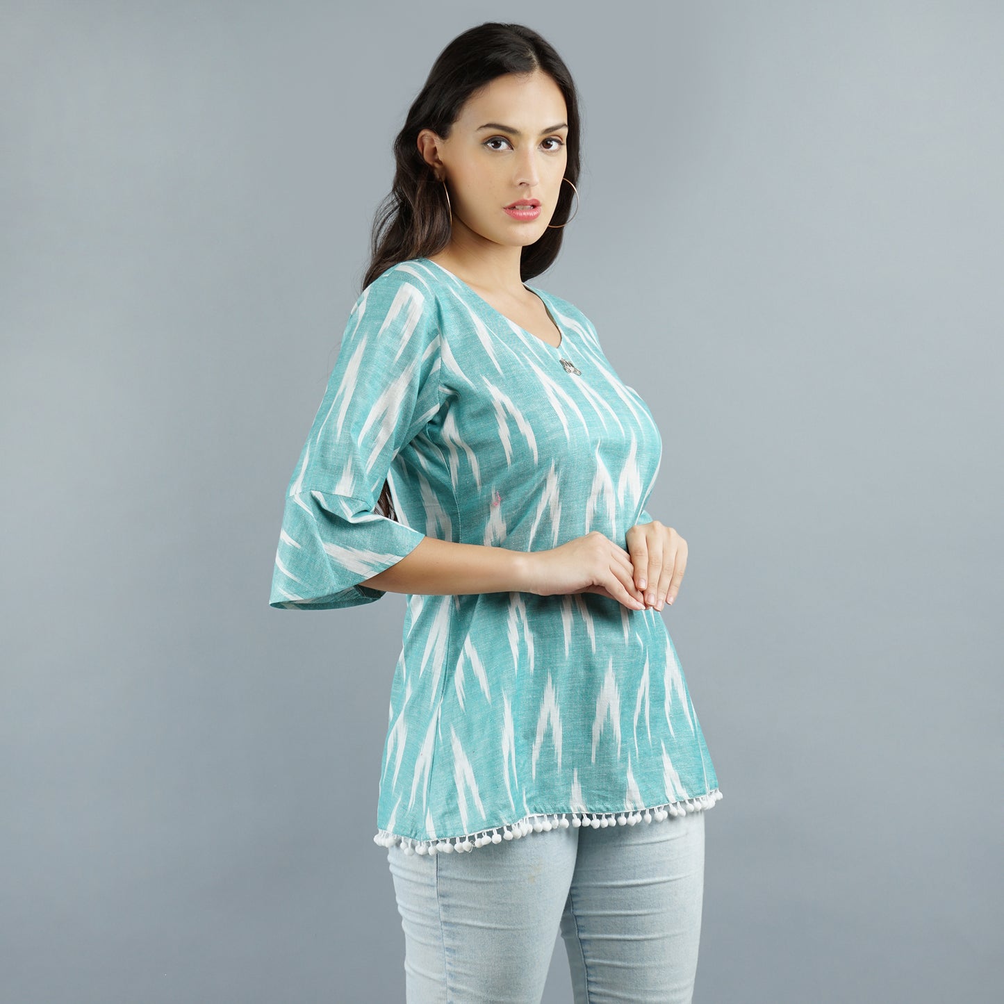 Darzaania Green (Sea Green) Ikat Cotton Top with Laced Hem.
