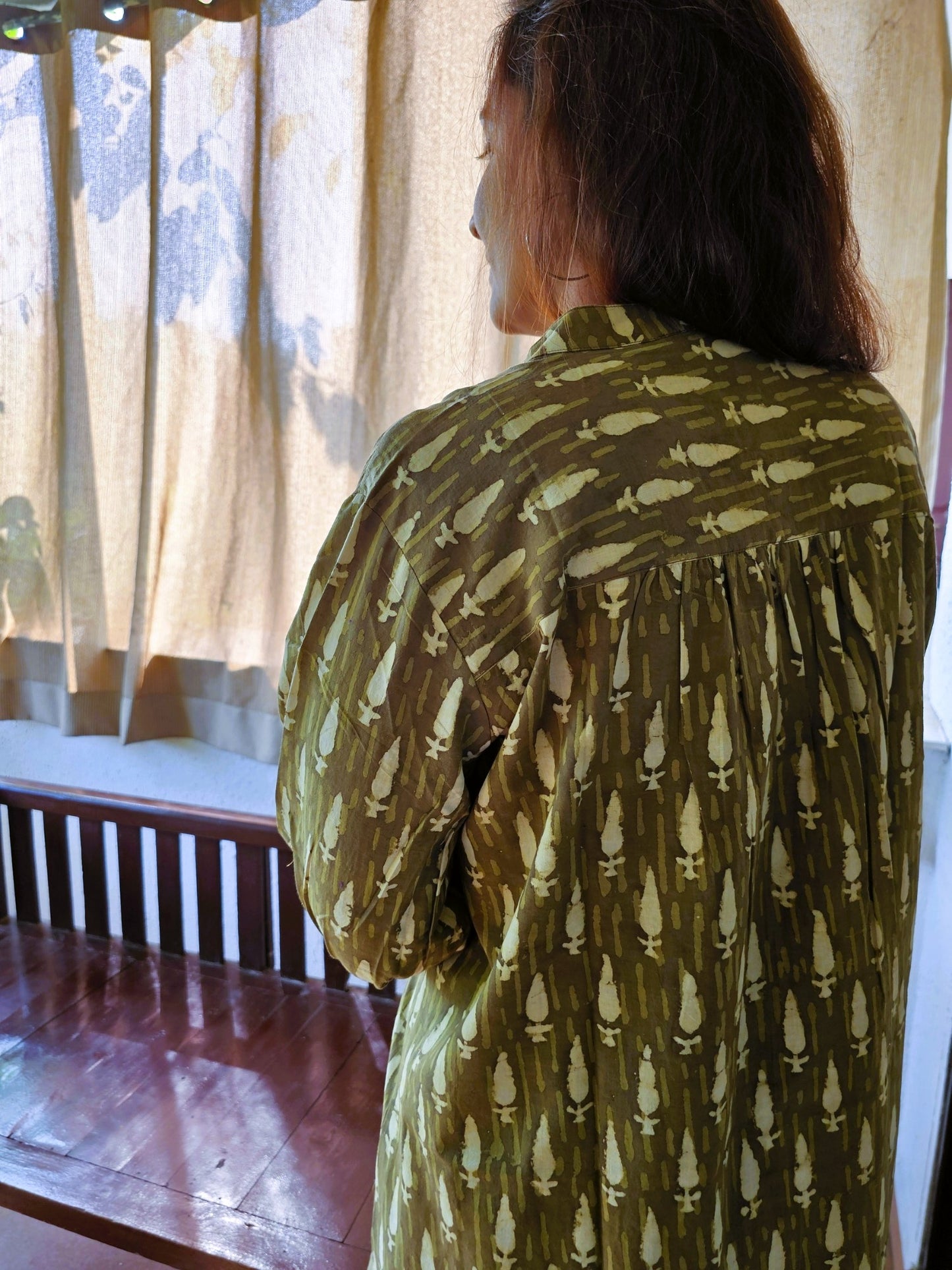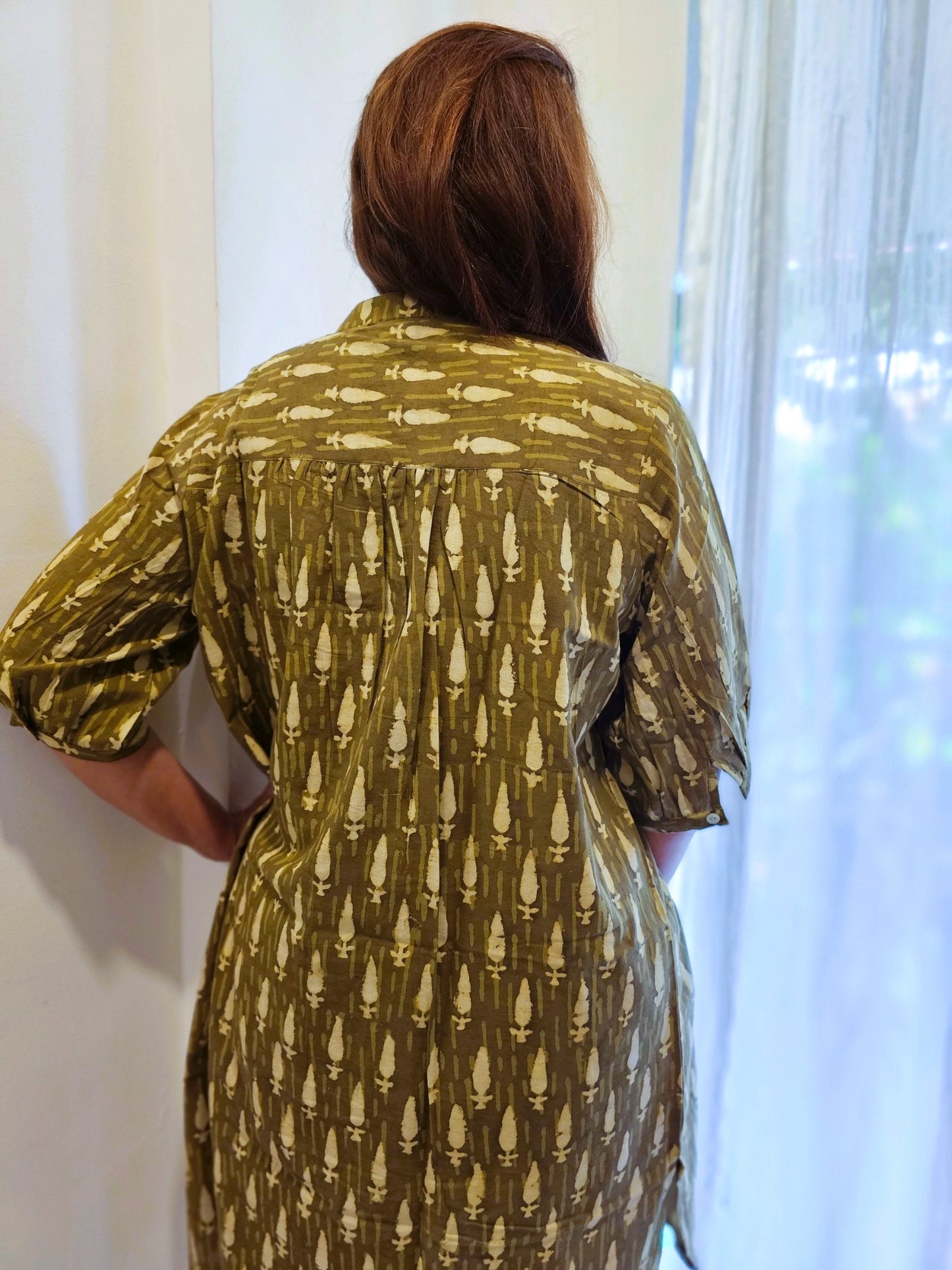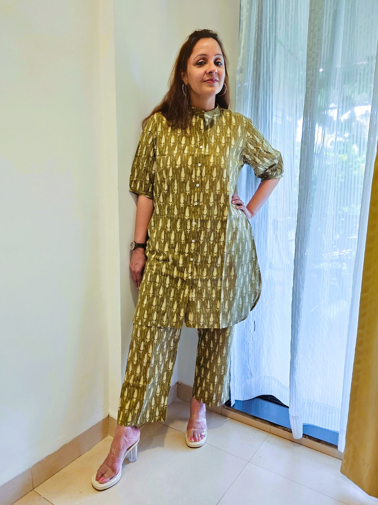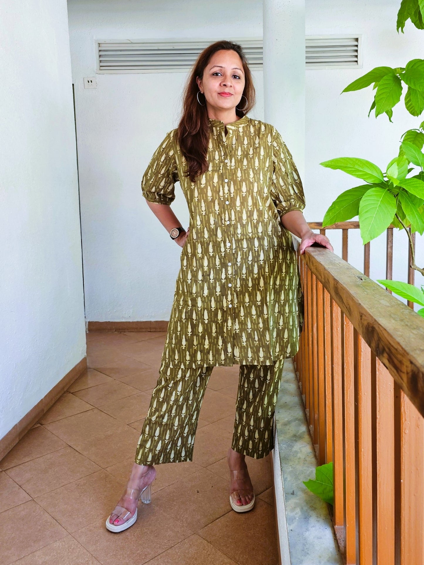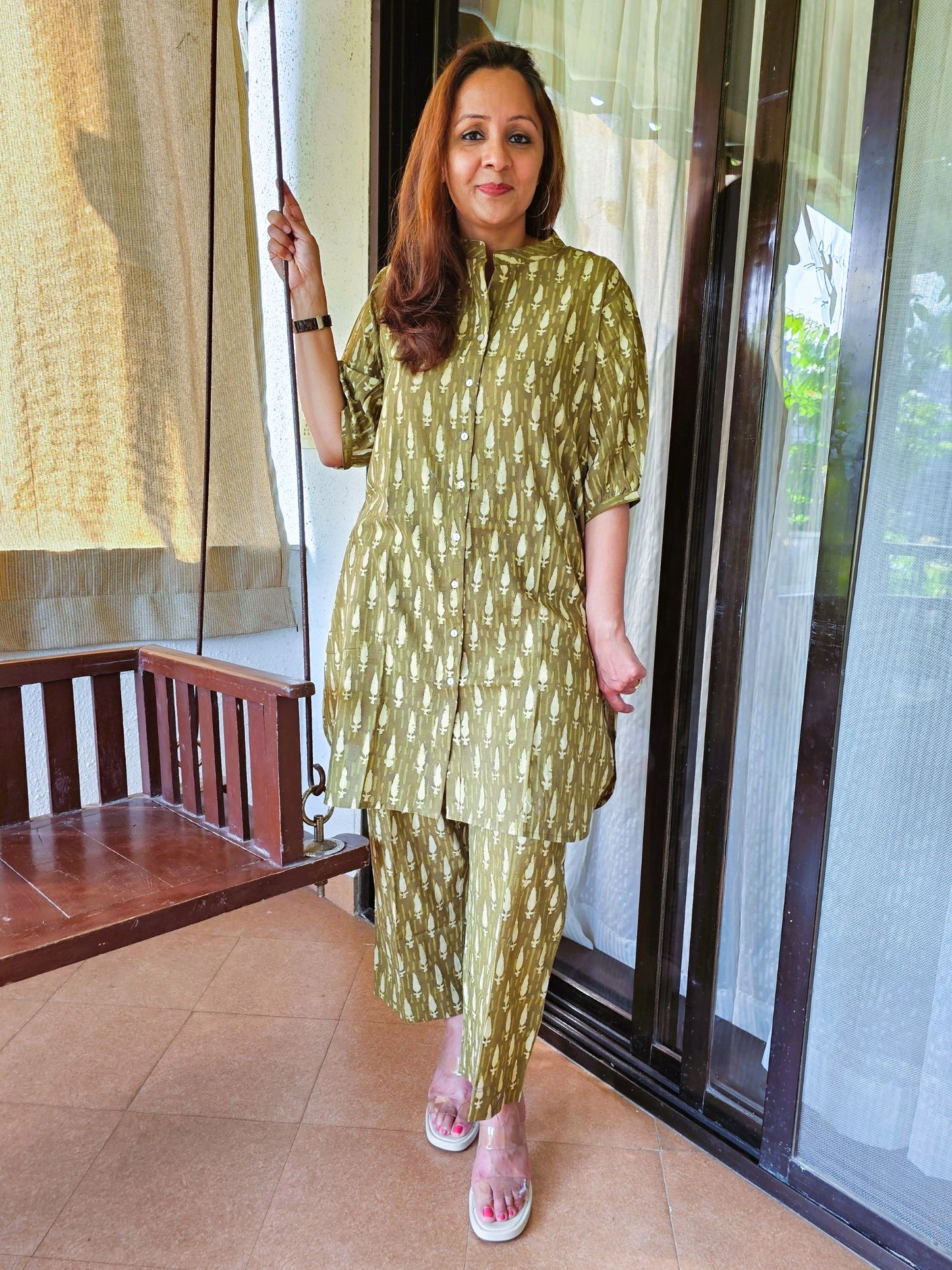 Darzaania Naomi Olive Block Print Cotton Co-Ord Set