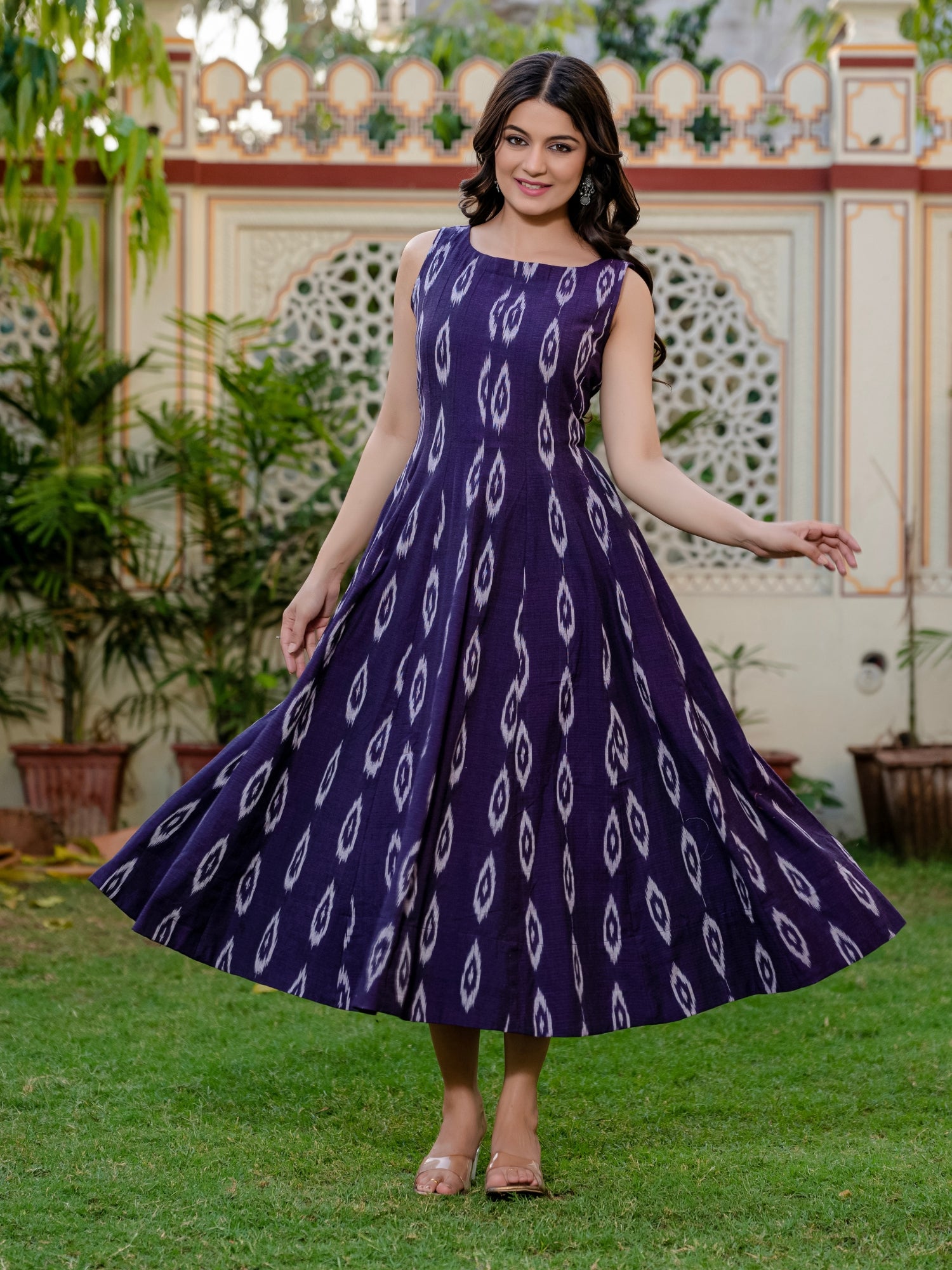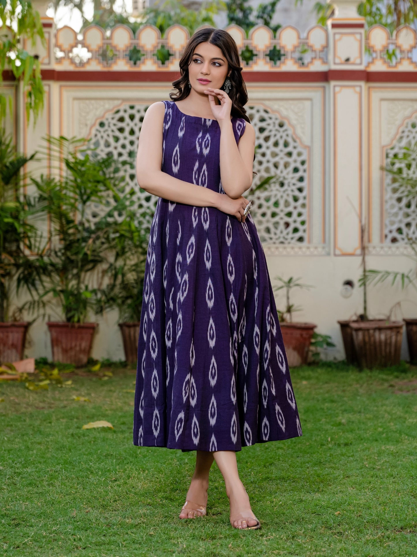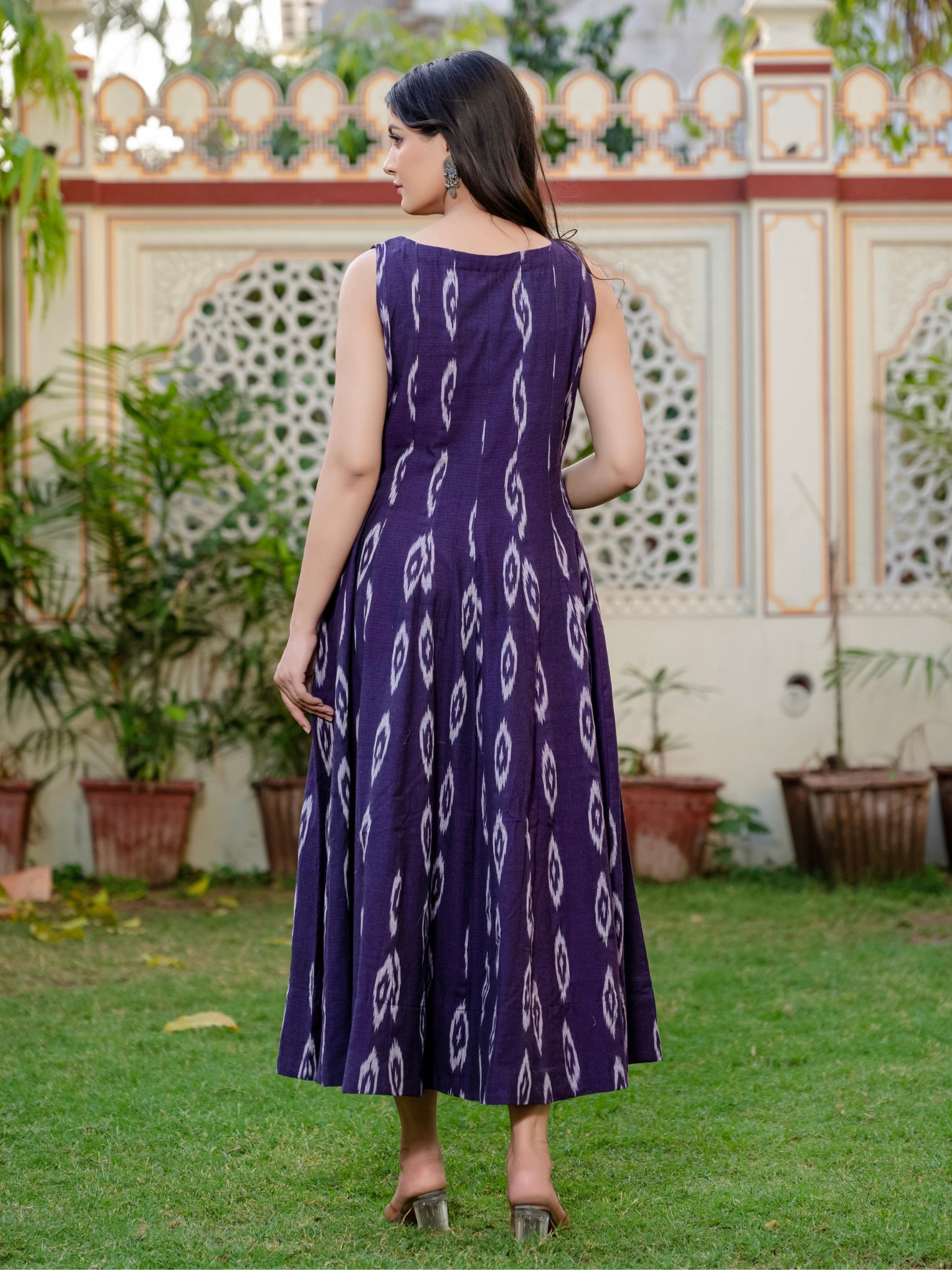 Darzaania Violet Vibe Ikkat Handloomed Cotton Dress
