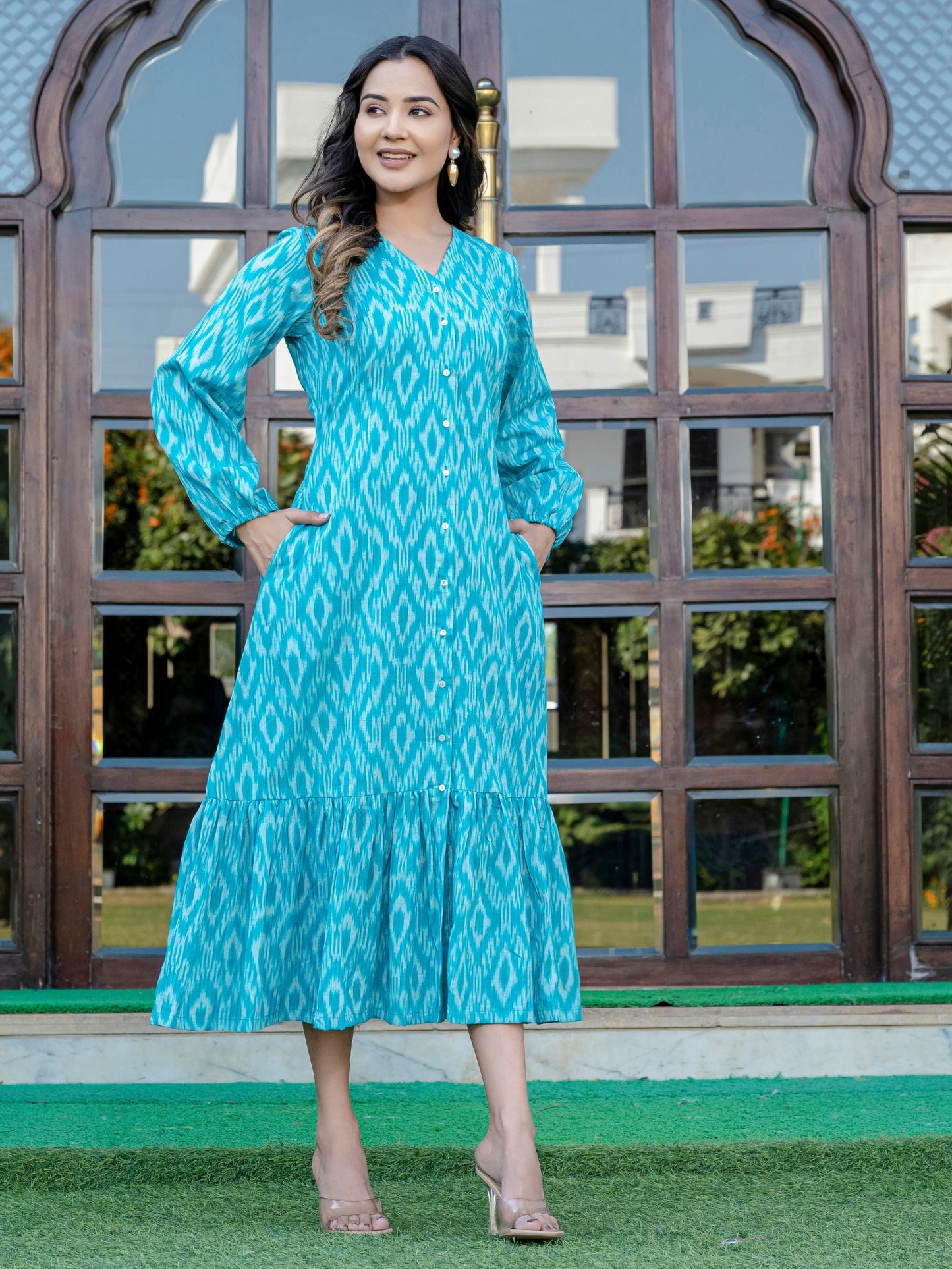 Unleash your individual style with the Zafira Bespoke Cotton Blue Dress. This must-have dress features long sleeves and premium cotton fabric for a comfortable fit. Perfect for any party or smart casual occasion, you'll stand out in this unique and playful design.